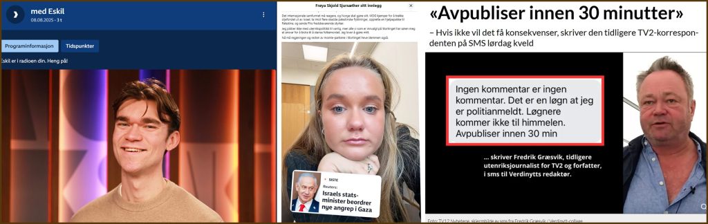 On the left: NRK Host Eskil Flem with a new anti-Semitic joke in the well-known NRK style. In the middle: MDG Member of Parliament Frøya Skjold Sjursæther accuses Israel for her not being able to do her job. On the right: Former TV2 journalist Fredrik Græsvik threatens verdinytt.no for having reported on a police complaint regarding his anti-Semitic comment on X. (Screenshot from: NRK, Facebook and verdinytt.no)
