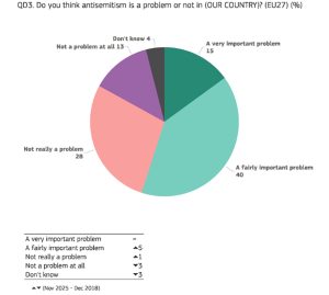- Et økende flertall av europeere (55% sammenlignet med 50% i 2018) anser antisemittisme som et problem.