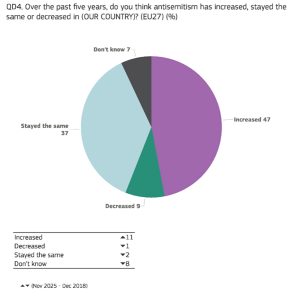- 47% av europeere (36% i 2018) mener at antisemittisme har økt i landet deres de siste fem årene.