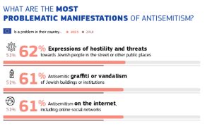 - 61% sier at antisemittisk graffiti eller hærverk og antisemittisme på nett (50% i 2018) er et problem i landet deres.