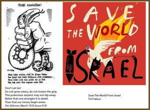 Et av nazistenes viktigste propagandaverktøy var karikaturer formidlet via avisen Der Stürmer. I Norge har vi palestinaaktivist Tiril Valeur (Holter-Andersen) fra Kristiansand, som i tillegg til å skrive og illustrere barnebøker, produserer antisemittiske tegninger som burde være straffbare i et hvilket som helst land i Europa. I likhet med Der Stürmer tegner hun Israel (les jødene) som slangen med budskapet: «Redd menneskeheten fra Israel».