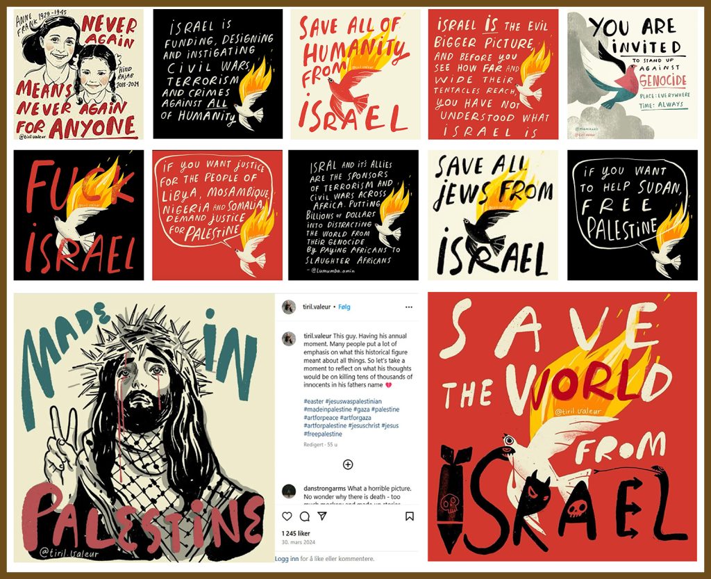 Et av nazistenes viktigste propagandaverktøy var karikaturer formidlet via avisen Der Stürmer. I Norge har vi palestinaaktivist Tiril Valeur (Holter-Andersen) fra Kristiansand, som i tillegg til å skrive og illustrere barnebøker, produserer antisemittiske tegninger som burde være straffbare i et hvilket som helst land i Europa. I likhet med Der Stürmer tegner hun Israel (les jødene) som slangen med budskapet: «Redd menneskeheten fra Israel».